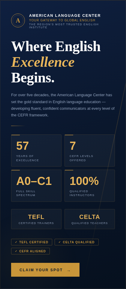 All students take a free placement test aligned with CEFR (A1–C2) to ensure the right class placement.
